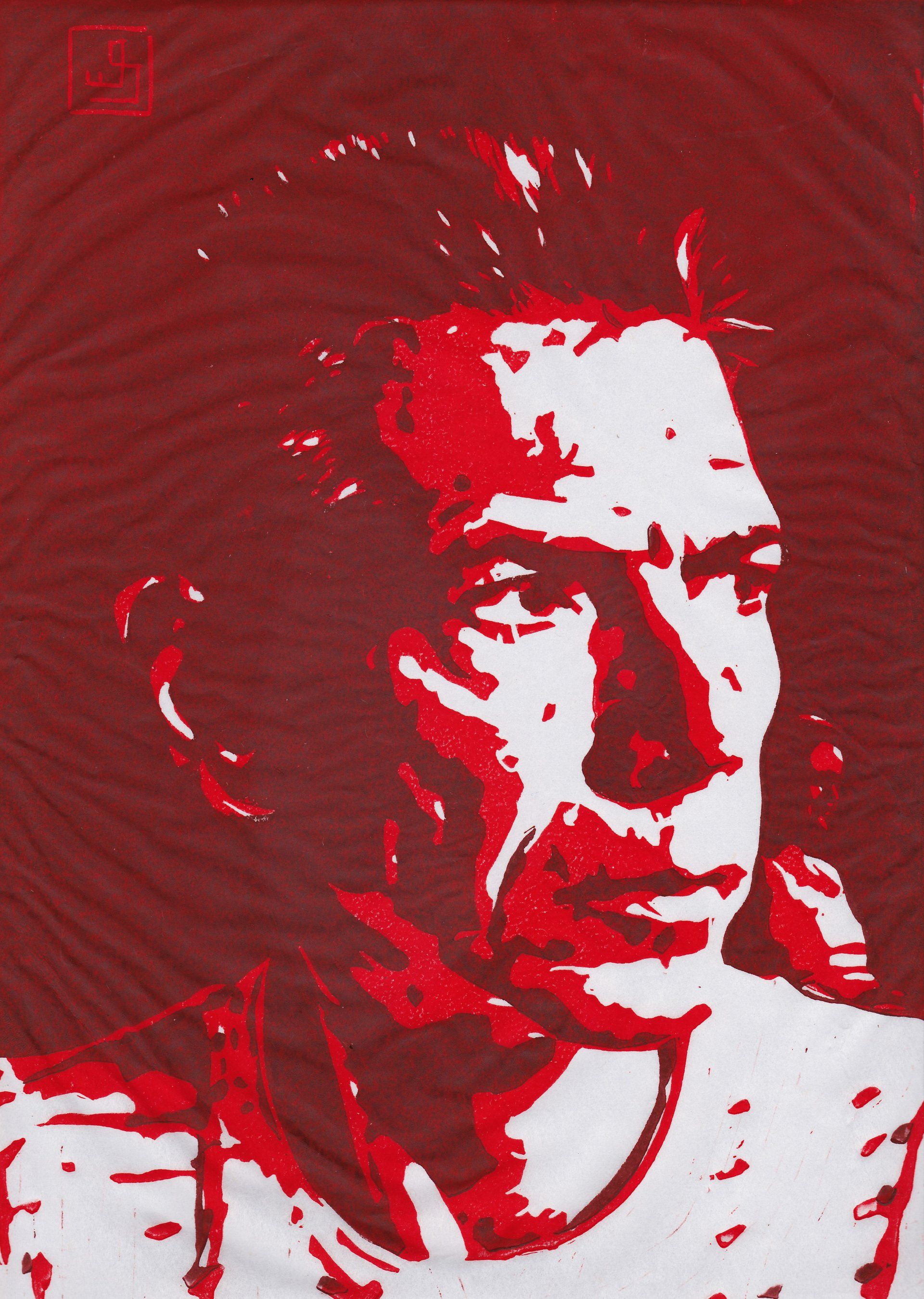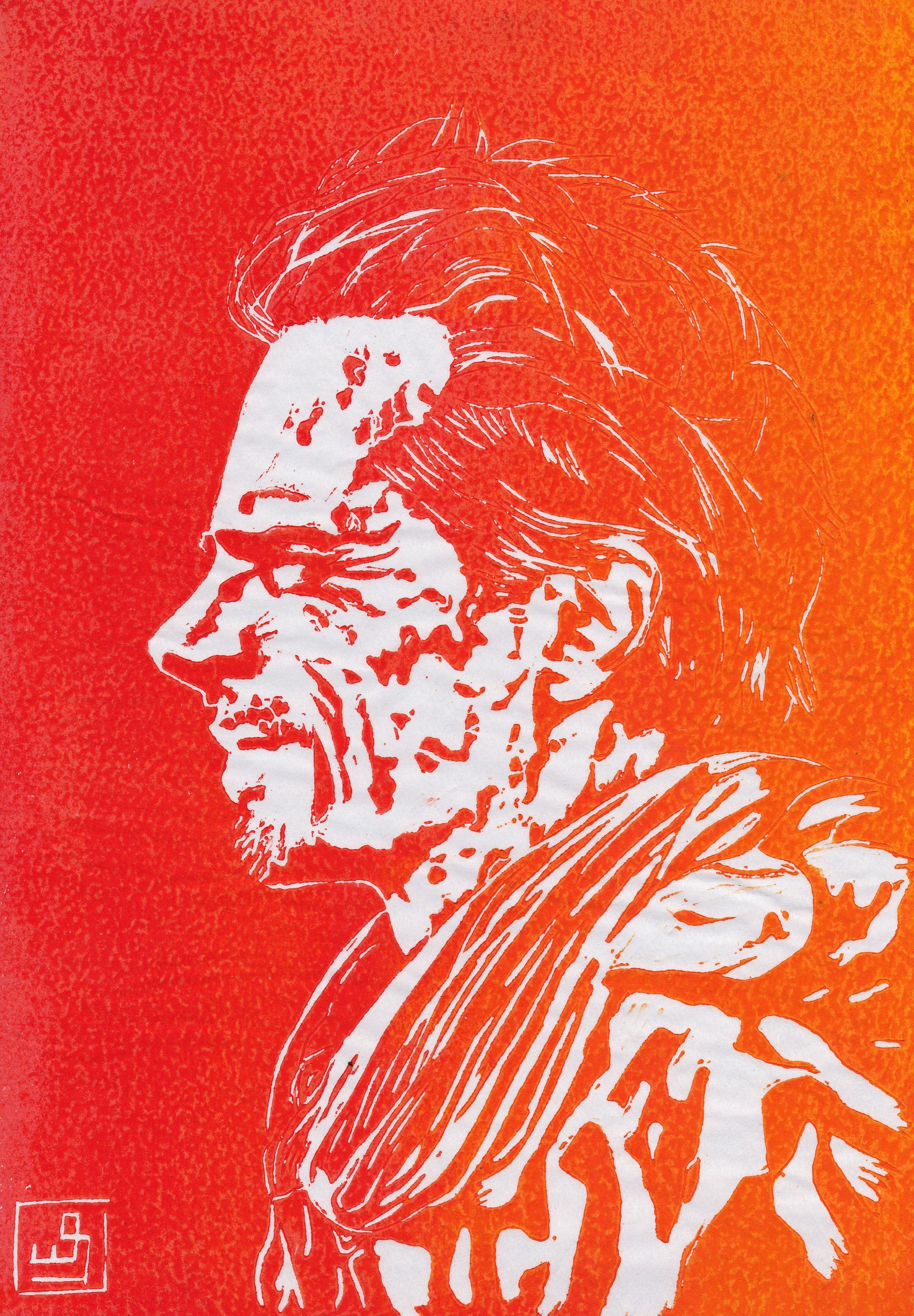 Hierbij ga ik als volgt te werk. Allereerst bepaal ik in hoeveel lagen ik de beeltenis wil afdrukken. Meestal ga ik voor een maximum van drie a vier lagen. Vervolgens maak ik een tekening van de beeltenis. Daarna breng ik de tekening in spiegelbeeld over op een. Hierbij geef ik duidelijk aan in welke volgorde ik de lagen weg zal snijden.